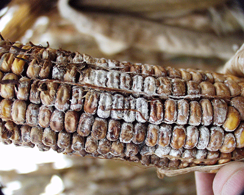 Heavy dews, leaf wetness, silk wetness, incomplete pollination, as well as stress through environmental factors such as drought, heat, cold, and pests play an important role in the formation of mould. Disease such as Northern corn leaf blight and stalk rot can also open the door to a Giberella infection.