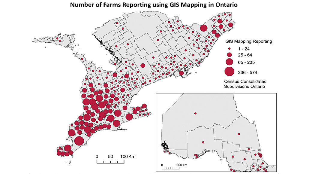 At the University of Guelph’s Department of Geography, PhD student Emily Duncan worked to analyze these questions and developed maps illustrating adoption of these farm technologies in Ontario.