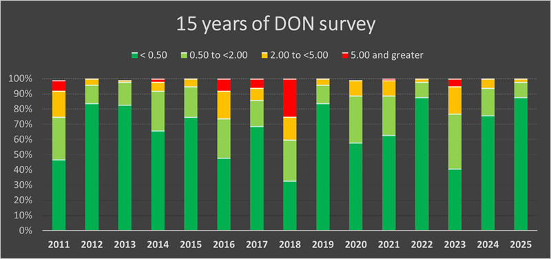 As shared last week, the 2025 Ontario Grain Corn Ear Mould and Deoxynivalenol (DON) Mycotoxin Survey has now been posted. This year’s survey found that 98 per cent of samples tested low (below 2.00 parts per million (ppm)). For more general information on DON in corn view this factsheet.