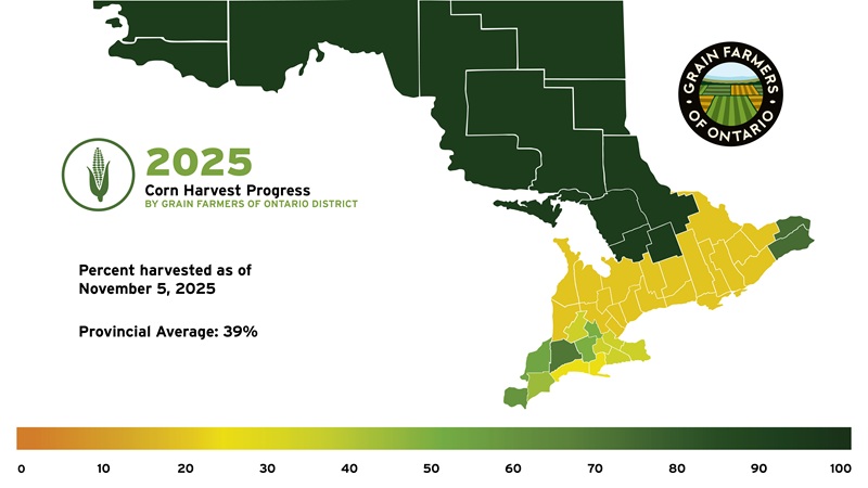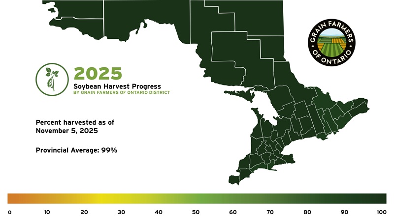 Field Progress– Grain Farmers of Ontario’s weekly estimation of planting and harvest across the province, by district, reports that winter wheat planting is 100 per cent, soybean harvest is at 99 per cent, and corn harvest is at 23 per cent as of October 29, 2025.