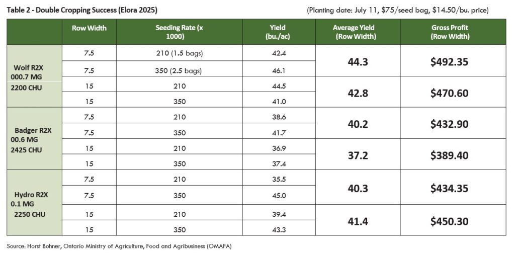 The figures from the 2025 test plots at the Elora Research Station indicated double-cropping is possible, albeit under ideal conditions and with the necessary adjustments in maturity group (Table 2). Row widths had less of an impact; however, seeding rate was key. Bohner determined the traditional numbers – 250,000 seeds per acre – aren’t sufficient for a location like Elora and should be increased to 263,000.